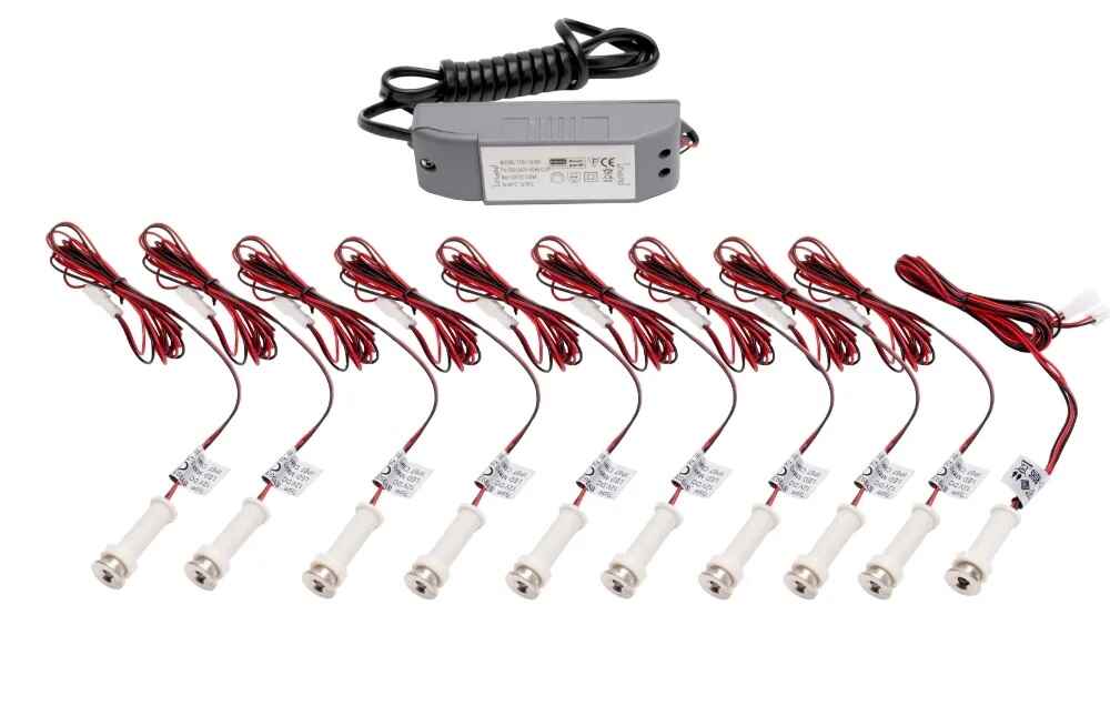 10 x round 15 mm plinth lights in a warm white colour. Power converter included and can run a maximum of 10 lights.